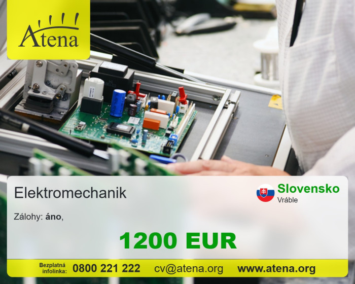 Hľadáte stabilnú a fyzicky nenáročnú prácu v čistom prostredí? Pridajte sa k poprednej elektrotechnickej spoločnosti vo Vrábľoch! Hľadáme mužov, ženy, páry aj absolventov na jednoduchú manuálnu prácu, ktorá zahŕňa osádzanie dosiek plošných spojov, spájkovanie a testovanie súčiastok. Predošlú prax vôbec nepotrebujete, všetko vás od základov trpezlivo naučíme. Práca prebieha v stoji aj v sede na 8-hodinové zmeny. Ponúkame vám priemerný plat 1 200 € mesačne, možnosť čerpať zálohy 2x týždenne (už po 3 odpracovaných dňoch!), príspevok na dopravu, zabezpečenú stravu a k tomu skvelé letné aj zimné odmeny. Urobte krok k lepšej práci a kontaktujte nás ešte dnes na bezplatnej linke 0800 221 222 alebo nám napíšte na cv@atena.org!